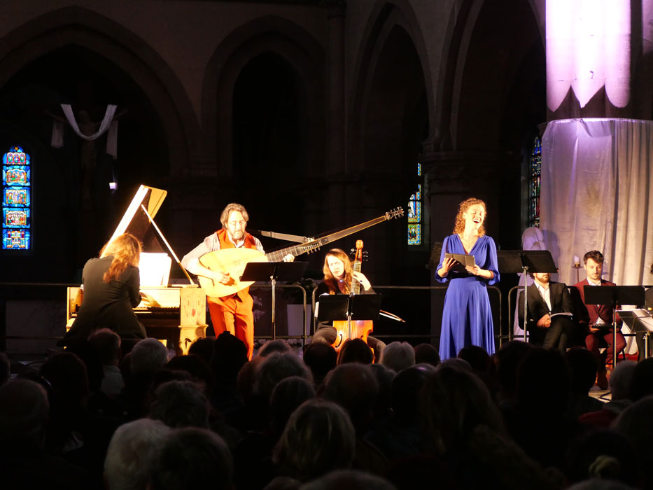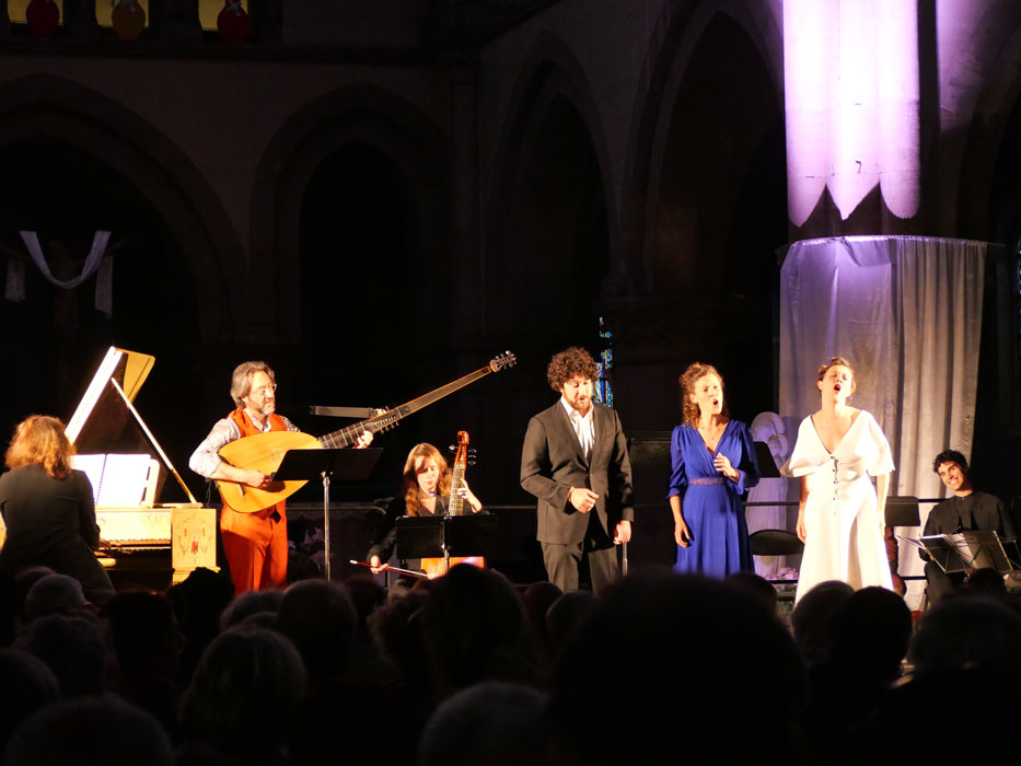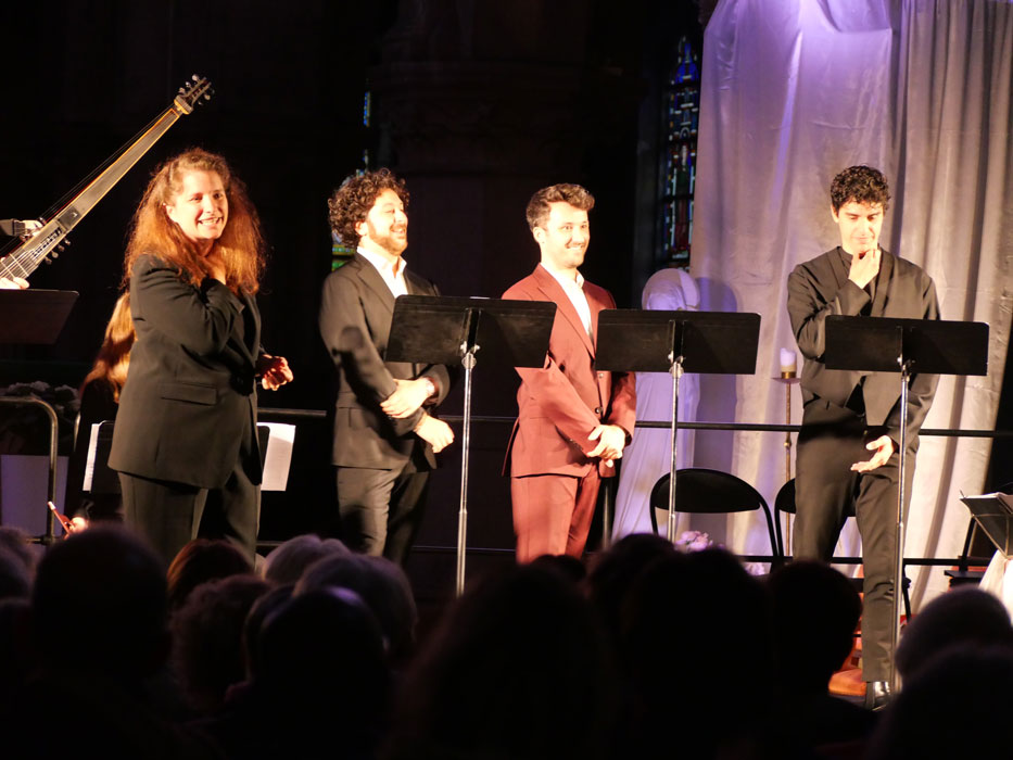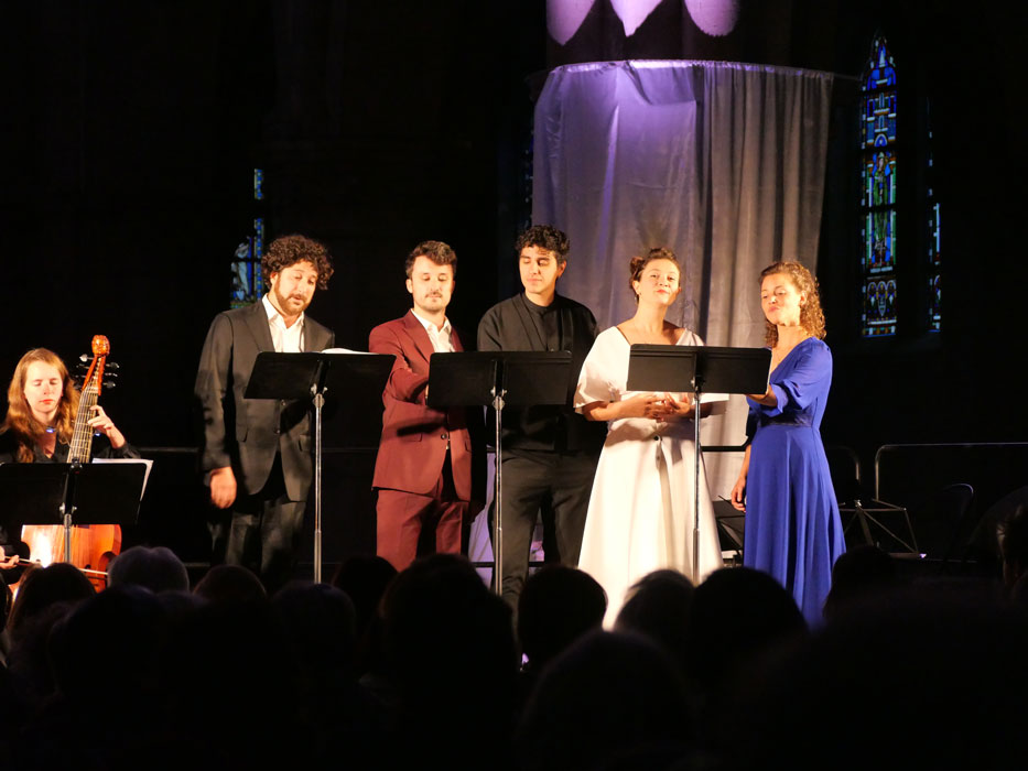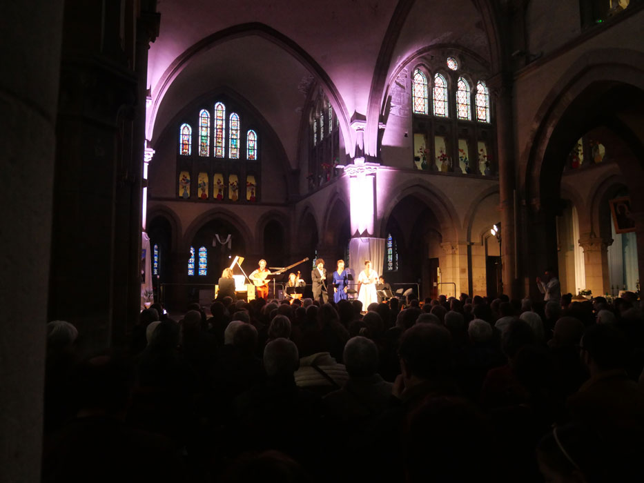 Le concert commence alors que le jour n’a pas encore laissé sa place à la nuit… et puis, lentement, la nef de notre église se plonge dans la pénombre alors que les huit artistes se détachent dans la lumière des projecteurs.