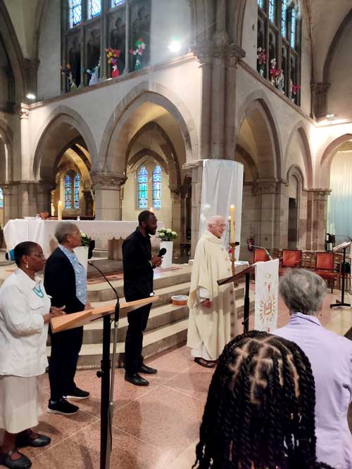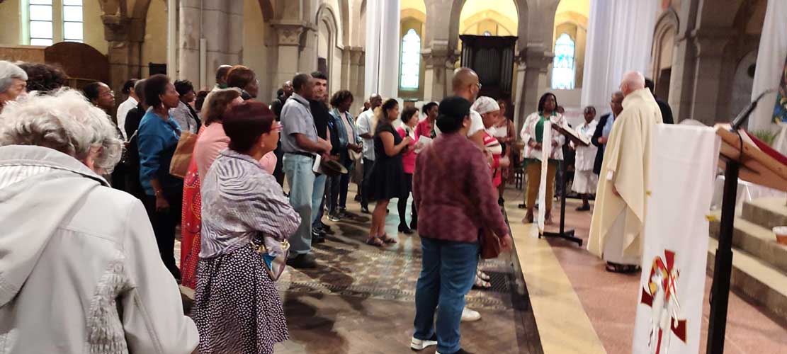 C’est à la fin de la messe que tout s’est accéléré. Josiane a tout dirigé de main de maître. Elle prend la parole. Le chant “En todo amar y servir” (traduction : en tout aimer et servir) résonne une première fois dans la nef. Toute l’assemblée fait corps et se rapproche doucement de l’autel jusqu’à entourer le père Claude de sa présence. Un joyeux anniversaire est chanté. Sur le côté, j’attends que Josiane me fasse signe de venir lire ce mot que j’ai préparé. Peterson Alcius sj nous invite à un temps de prière en communion pour la célébration de cet anniversaire. Josiane m’invite à venir au micro. Je peux lire ce message préparé en dernière minute (alors qu’un autre était écrit depuis des jours…).