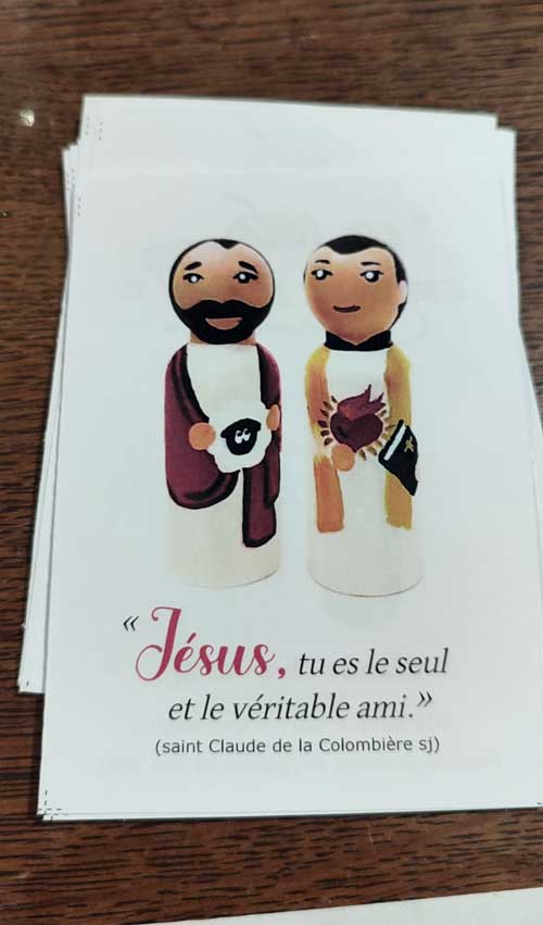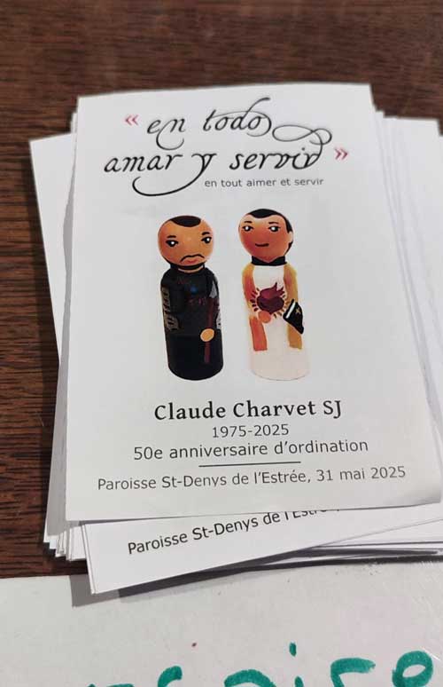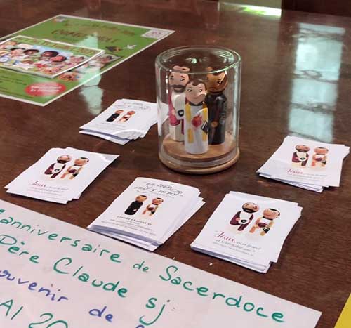Ce samedi 31 mai, la messe se déroule comme d’habitude, si ce n’est que le père Claude sj nous explique que ce jour est son 50e anniversaire d’ordination… et qu’il est venu avec ce cadeau que lui avait fait sa sœur Elizabeth. Ce sont d’ailleurs ces objets qui serviront à la communion.