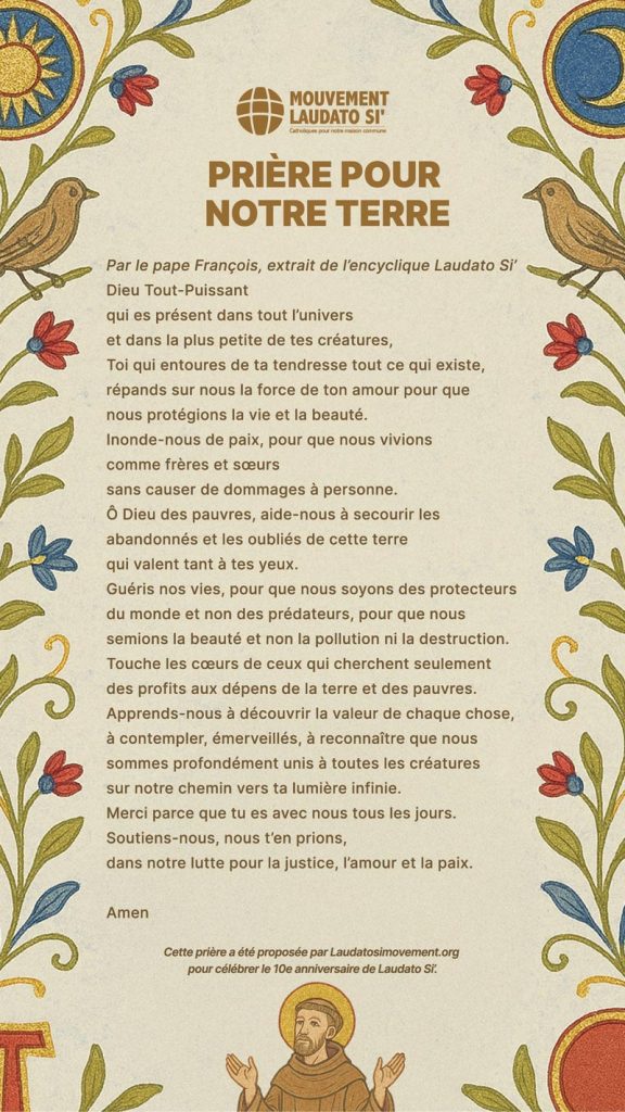 Parce que nous fêtons les 10 ans de l’encyclique Laudato Si’ du pape François, Laudatosimovement.org nous propose une prière pour Le Temps pour La Création 2025. (j’ai trouvé cette carte-prière sur le site egliseverte.org)