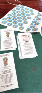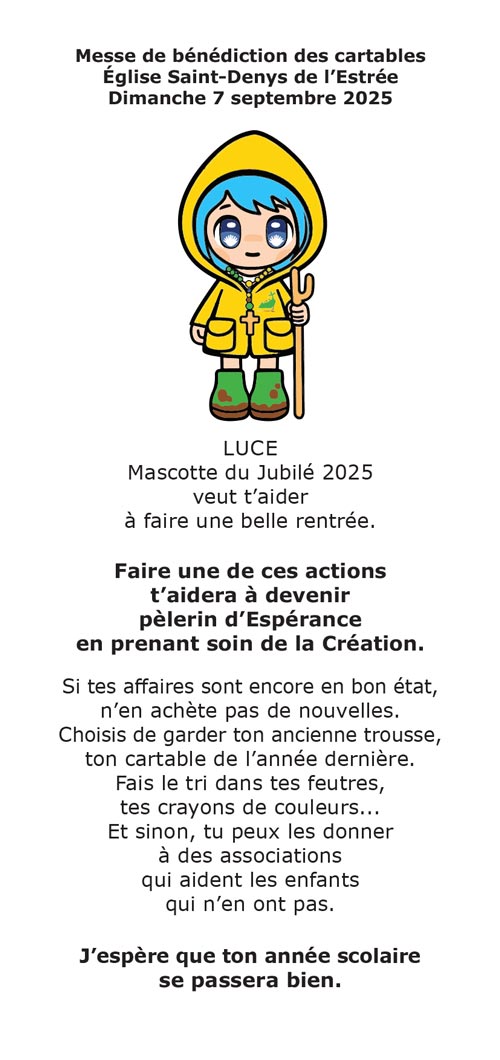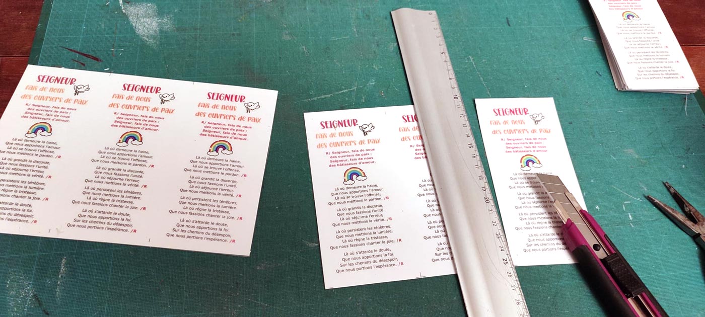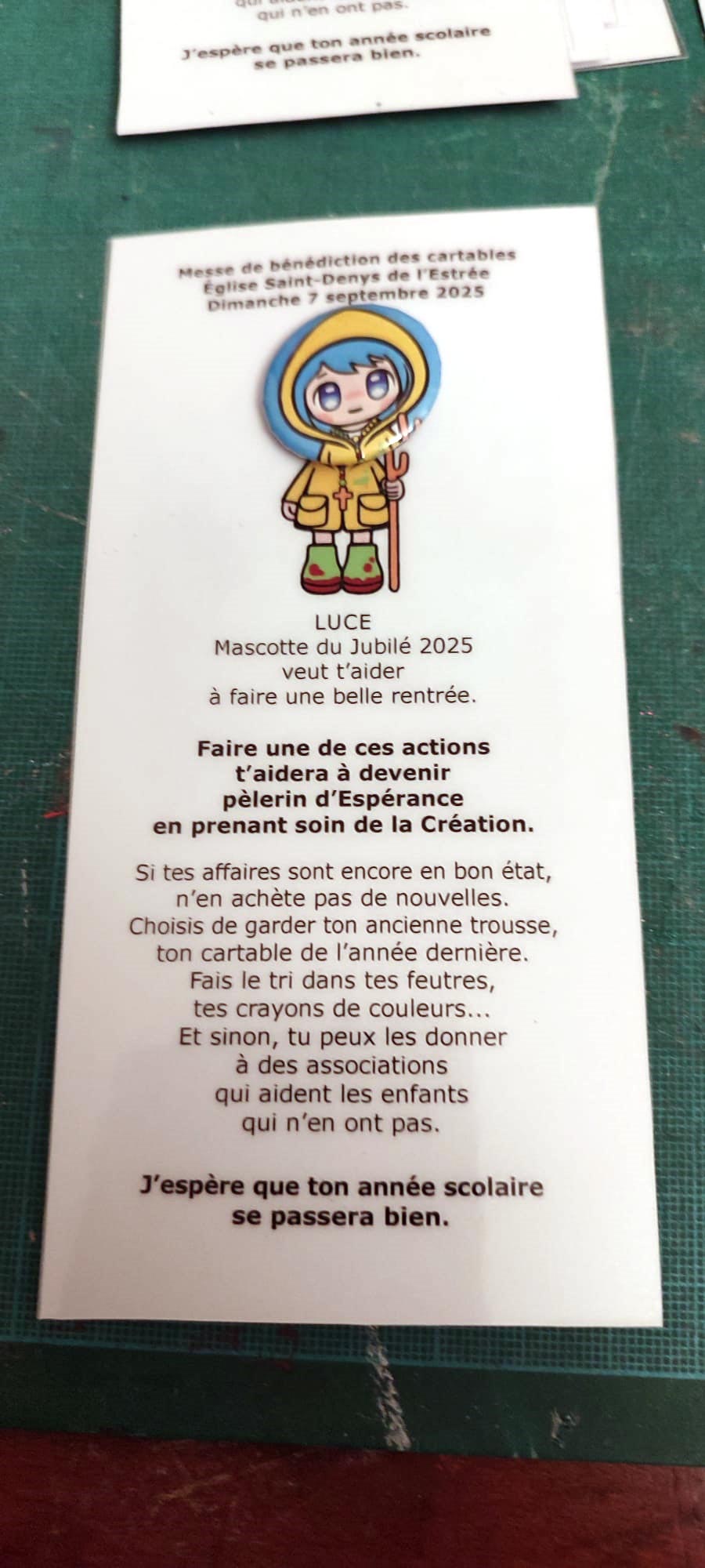 Aujourd’hui, c’était messe de bénédiction des cartables dans notre église… Alors, cette semaine, en quelques heures et avec la participation du père Claude Charvet sj, je me suis appliquée à faire un quelque chose spi, doux, que les enfants (et les adultes) pourront garder en souvenir de la célébration de ce dimanche matin. C’est une carte qui a été faite… Enfin… Pas qu’une seule… J’en ai fait 83 (de manière complète – c’est-à-dire avec le badge -)… et puis, m’étant trompée lors du lancement de l’impression, il y en a eu en tout pas moins de 150…