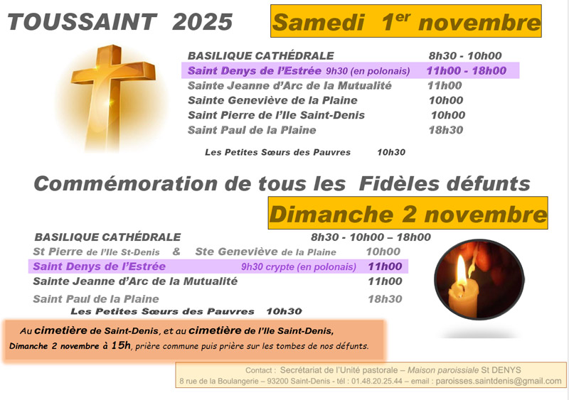 Fête de Toussaint et Jour de prière pour les défunts. Les horaires des messes sont affichés à l’entrée de l’église (le samedi 1er novembre, messe comme un dimanche).