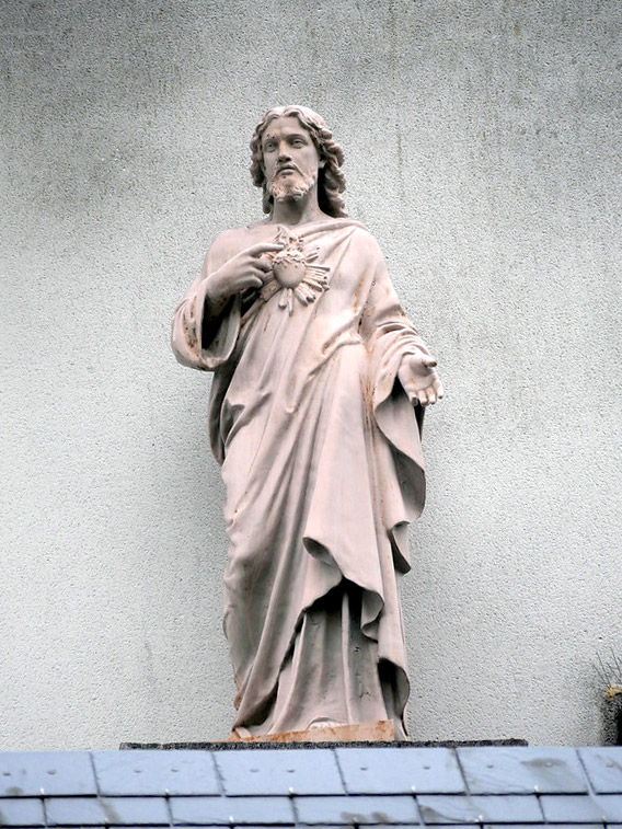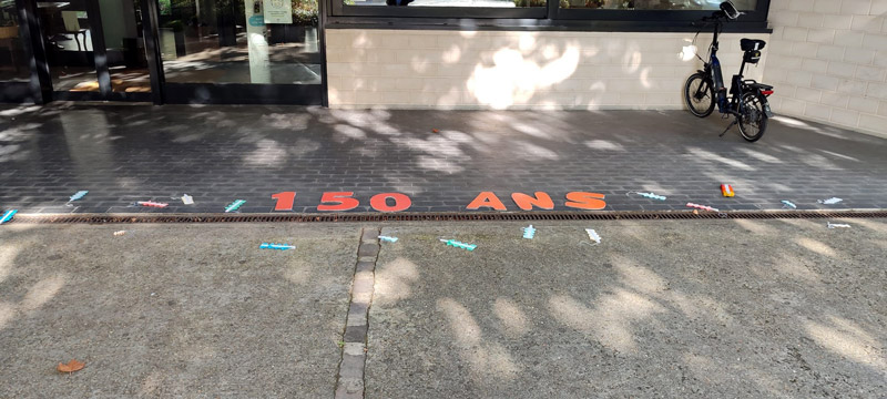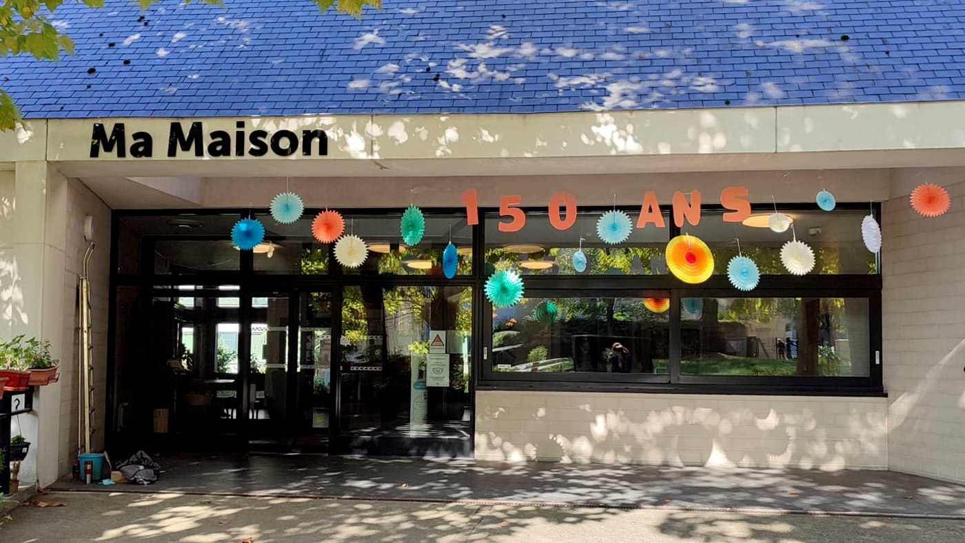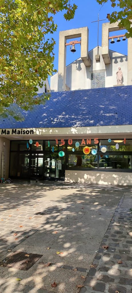 Pour la décoration du porche de Ma maison, l’histoire est jolie. Un ami prêtre sait que je m’occupe de décorer la maison. Il me fait un colis. Depuis Lille, il m’envoie la décoration qui vient tout juste de servir à sa propre fête (celle de ses derniers vœux de jésuite). Les guirlandes, les soleils, tout est en papier. Je choisis d’accrocher en hauteur les soleils. Sous le porche, ils sont protégés d’une éventuelle pluie. Dans la cave où j’ai tant œuvré ces derniers jours, je crée un « 150 ans » avec du papier de couleur et du carton. Monsieur J. sort l’escabeau. Il a des choses à faire le matin où je viens pour faire cette mise en place alors il n’est pas présent. Le père Claude Charvet sj qui sort de la messe du matin, s’arrête et c’est ensemble que nous accrochons toute cette décoration. Sous le regard de la statue du Sacré Cœur de Jésus, je trouve cela joli. On voit la décoration de loin. On sent bien qu’on est à la fête en arrivant ici.