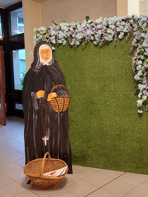 Je suis de ces bénévoles qui offrent du temps pour ce bel anniversaire. J’offre tout le temps que je peux pour œuvrer à rendre la maison joyeuse et festive visuellement. Je ne peux m’occuper que d’une partie du rez-de-chaussée. L’animatrice de Ma Maison et des scouts se chargent de la déco de la grande salle des fêtes, de mettre en place dans le couloir qui y mène… Sœur Bernadette s’occupe de rendre Ma Maison plus joyeuse dans les étages… pour tous les résidents qui restent chez eux sans descendre au rez-de-chaussée. (Après la semaine festive, sœur Cornelia m’a fait l’amitié de m’emmener dans les étages… et en effet, sœur Bernadette a dû y passer quelques nuits à découper et coller sur les murs toutes ces illustrations pour le 150e anniversaire. À peine sortie de l’ascenseur au 2e étage, je me rends compte comme elle s’est appliquée, et au détour du premier couloir que nous prenons, je suis soufflée : « Quel travail ! ». Ce que sœur Bernadette a fait est grand. Il y en a beaucoup… et je sais bien le temps que cela prend de faire autant.)