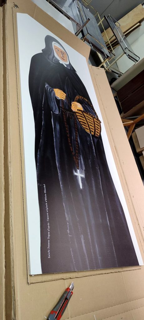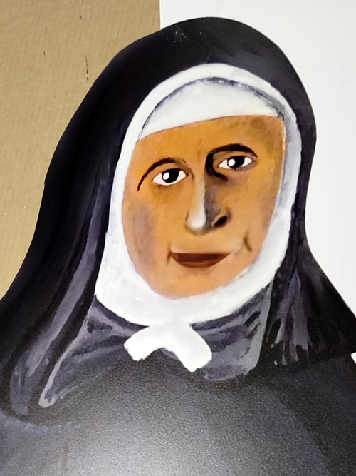 Avant les vacances d’été, nous faisions le tour de la cave avec sœur Bernadette. En arrivant dans le fond, là où il y a de si nombreux cadres, nous cherchons un grand portrait de Jeanne Jugan. Nous cherchons mais rien ne m’inspire vraiment. Et puis… me tournant sur la droite, je vois des décors de crèche, des anges… et elle est là… Elle est là celle que je cherchais. Elle mesure environ 1,60 m. Elle est peinte sur un carton. Je me retourne vers sœur Bernadette et je lui dis : « C’est elle ! C’est notre Jeanne Jugan ! C’est elle qui doit nous accueillir dans l’entrée de Ma Maison ! ». Sœur Bernadette acquiesce. Elle me dit que celui qui l’a faite va être ravi que nous utilisions son dessin. Celui qui l’a dessinée, c’est monsieur Olivier B., résident de Ma Maison. C’est un monsieur que j’ai croisé plusieurs fois et que je trouve particulièrement discret. Pas très volubile non plus, il n’aime pas non plus qu’on parle de lui. Je pressens déjà que s’il apprend que je le nomme ici, il se sera gêné… Et pourtant… Très discrètement, j’ai quand même glissé son nom sur la représentation d’1,80 m. de cette Grande Jeanne que nous avons faite imprimer sur carton-plume. Je sais que j’ai raison de le nommer. Comme je vous le disais plus haut, il y avait d’autres éléments de décor dans cette cave. Tous sont de lui. Et puis, dans ce petit espace qui lui sert d’atelier au rez-de chaussée (espace que j’ai découvert il y a quelques jours à peine), je vois qu’il peint des bouquets de fleurs sur carton. Si j’avais su cela plus tôt, je l’aurais mis au travail cet été pour nous créer d’autres choses… Juste quelques bouquets peints par lui, cela aurait pu être si joli.
