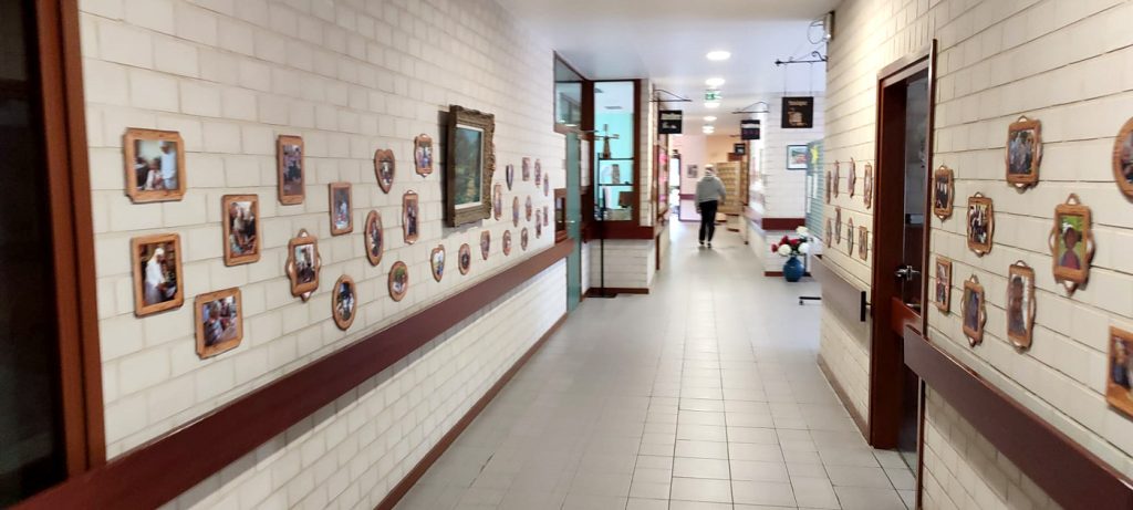Le dimanche matin, une équipe de guides (branche des Scouts de France) vient à Ma Maison pour une journée d’activité de bénévolat. Lorsque sœur Cornelia me l’annonce dans le courant de la semaine en me disant qu’elles pourront faire cette mise en place, je suis ravie de cette aide providentielle. Lorsque que je viens voir le résultat dans le courant du dimanche après-midi, je suis charmée ! Voir les photos des résidents, c’est quelque chose de beau. Et lorsque je m’imagine à leur place, je me dis qu’ils seront heureux de se voir en photo. Comme les témoins de ce qu’il se vit ici. Parmi ces photos, nous n’avons pas oublié celles et ceux qui sont partis rejoindre le Père récemment. Cela fait aussi du bien au cœur de savoir que même lorsqu’on décède, on n’est pas si vite oublié… et cela fait aussi toujours du bien de voir ceux qui ont été nos amis…