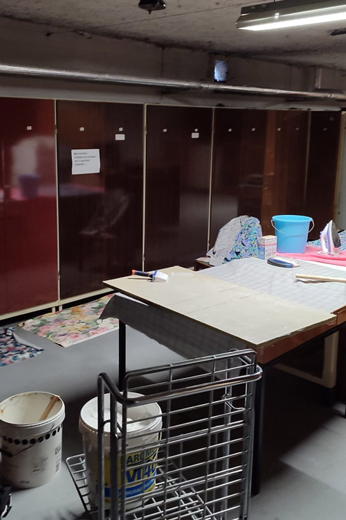 Lorsque je présente un mini-panneau de polystyrène recouvert d’un tissu collé à sœur Bernadette et monsieur J. (puisque l’équipe déco de cet anniversaire se résume à nous trois), on m’explique qu’il ne sera pas possible d’utiliser ce matériau. Pas sécuritaire du tout et totalement inflammable ! Pas de souci… Monsieur J. a déjà la solution : il y a des panneaux ignifugés quelque part dans la cave. C’est ceux-là qui seront utilisés. Quant au tissu, Monsieur J. me présente des grandes malles dans lesquelles je peux faire mon choix. Certains tissus sont si beaux que je préfère ne pas les utiliser. (Ils seront tellement mieux utilisés pour faire des vêtements.)