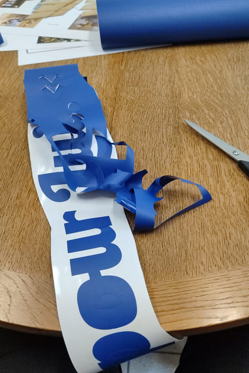 Dans le couloir qui mène à la salle des fêtes, l’idée est de mettre en avant les résidents. Parce que je ne veux pas afficher de simples feuilles de papier, monsieur J. met de côté un grand carton qui passait à la poubelle. Sur mon ordinateur, je prépare un fichier avec les photos que sœur Cornelia m’a envoyées. Toutes les impressions (mise à part la Grande Jeanne) sont faites chez les Petites Sœurs. Sœur Cornelia et Bhuvna (secrétaire salariée chez les Petites Sœurs) impriment tous les PDF que j’envoie sur du 160 gr/m². Cela rend bien. Les photos des résidents sont présentées comme dans des cadres en bois. Les feuilles sont découpées et collées sur du carton épais dans la cave avec l’aide de Cécile (le même après-midi que lors de la mise en place dans l’entrée). Je découpe ensuite chaque photo individuellement au cutter. Le carton est si épais qu’il me faut trois heures et demi pour découper les soixante-dix photos. La semaine de célébration commence le lundi 13 octobre. Le découpage des cartons est fait le samedi soir et je les amène le dimanche 12 octobre au matin chez les Petites Sœurs. Si je vous dis que tout ce que je vous raconte est réalisé durant les deux semaines qui précèdent la semaine d’anniversaire, croyez-le… Cela a été des jours intenses… Vraiment intenses…