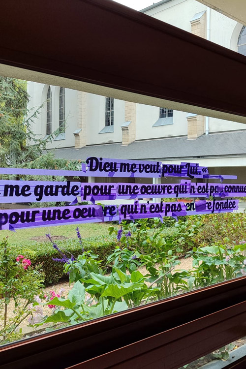 Les panneaux sont placés du côté de la salle de restauration. Du côté des fenêtres du patio, ce sont de grandes citations de Jeanne Jugan qui sont collées sur les fenêtres. Ces citations, c’est une idée à moi. Lorsque l’idée me vient au mois de juin, je me dis que je vais les écrire au marqueur indélébile sur du plastique transparent autocollant… et puis le temps passe… et cette réalisation reste en suspens dans mon esprit. Je ne sais finalement pas comment véritablement m’y prendre pour un joli résultat… Et puis, au dernier moment, quand je m’apprête à les réaliser, je me rappelle que j’ai du papier adhésif de couleur… et comme j’ai aussi un plotter de découpe, je prends la décision de découper les citations plutôt que de les écrire à la main. Quelle belle inspiration sortie de JeNeSaisOù ! Cela est d’un joli effet. Après présentation d’un test à l’équipe déco, cela est validé par les Petites Sœurs et mère Elizabeth.