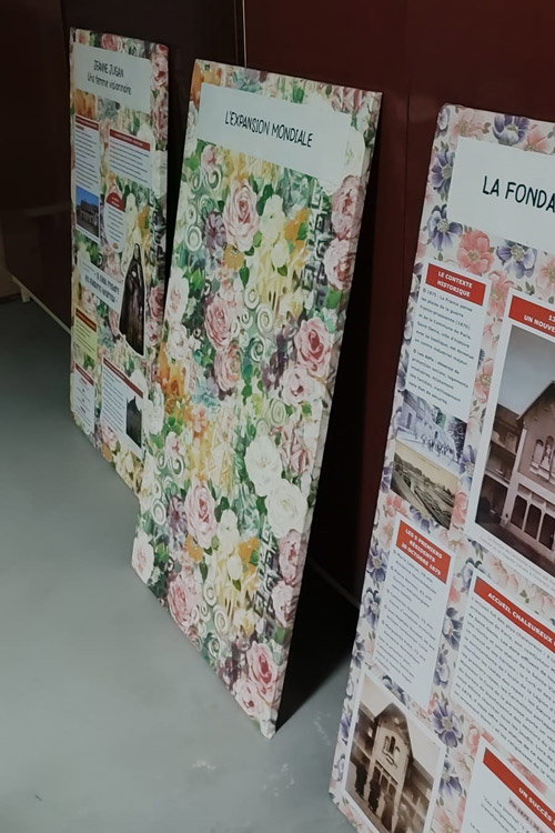 C’est l’endroit qui m’a demandé le plus de labeur. Pour le concevoir, il a d’abord fallu que je fasse connaissance avec Jeanne Jugan. Même si cela fait quelques années que j’ai passé pour la première fois la porte de Ma Maison, je dois bien avouer que je ne connaissais pour ainsi dire rien de la vie de cette sainte, mère fondatrice des Petites Sœurs des Pauvres, canonisée en 2009 par le pape Benoît XVI. L’idée est de faire des panneaux – comme une exposition –. Comme pour tout ce que nous faisons, nous faisons le minimum d’achat et surtout avec les éléments que nous avons à disposition ; il en est de même pour cette partie.