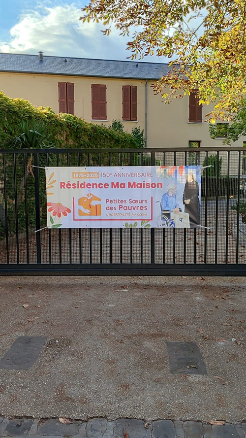 Dès le portail, on peut voir qu’il y a un bel anniversaire ici. Cette bâche que vous voyez en photo, c’est moi qui l’ai conçue avec l’aide des Petites Sœurs et de leur mère supérieure, mère Elizabeth Jean. Nous avons eu quelques allers-retours de mails. Chaque remarque a été prise en compte… et si l’image principale a été créée avec une IA, elle l’a été en partant d’une véritable illustration d’une Petite Sœur (celle qui s’occupe de peindre pour leurs lettres de nouvelles)… et comme les IA ne font pas tout, il a quand même fallu que je joue du pinceau sur Photoshop afin de parfaire le scapulaire et la coiffe.