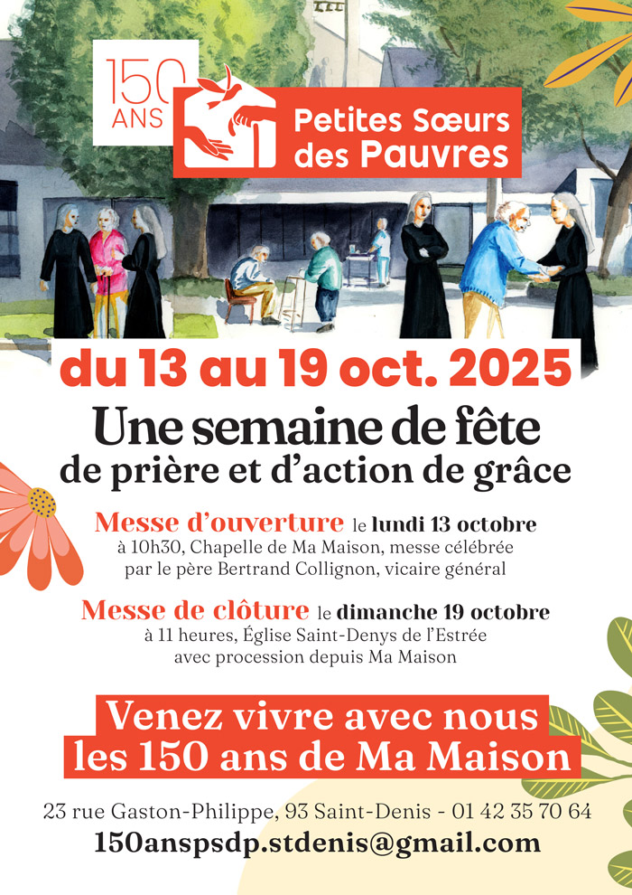 La messe dominicale clôturant la semaine de célébration des 150 ans de présence des Petites Sœurs des Pauvres à Saint-Denis a lieu dans l’église Saint-Denys de l’Estrée. Elle est même télévisée. J’y lis une intention de prière : « Seigneur, nous Te rendons grâce pour tous les bienfaits reçus et nous Te prions pour tous ceux qui ont à cœur de soutenir généreusement tous les démunis, les pauvres et les malheureux. Comble chacun de Tes bénédictions et de Ta joie. » Elle est courte et même si je n’œuvre pas directement auprès des plus démunis, elle me ressemble malgré tout.