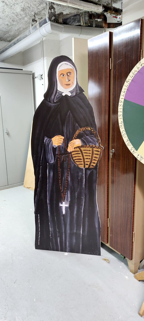 C’est l’endroit qui m’a demandé le plus de labeur. Pour le concevoir, il a d’abord fallu que je fasse connaissance avec Jeanne Jugan. Même si cela fait quelques années que j’ai passé pour la première fois la porte de Ma Maison, je dois bien avouer que je ne connaissais pour ainsi dire rien de la vie de cette sainte, mère fondatrice des Petites Sœurs des Pauvres, canonisée en 2009 par le pape Benoît XVI. L’idée est de faire des panneaux – comme une exposition –. Comme pour tout ce que nous faisons, nous faisons le minimum d’achat et surtout avec les éléments que nous avons à disposition ; il en est de même pour cette partie.