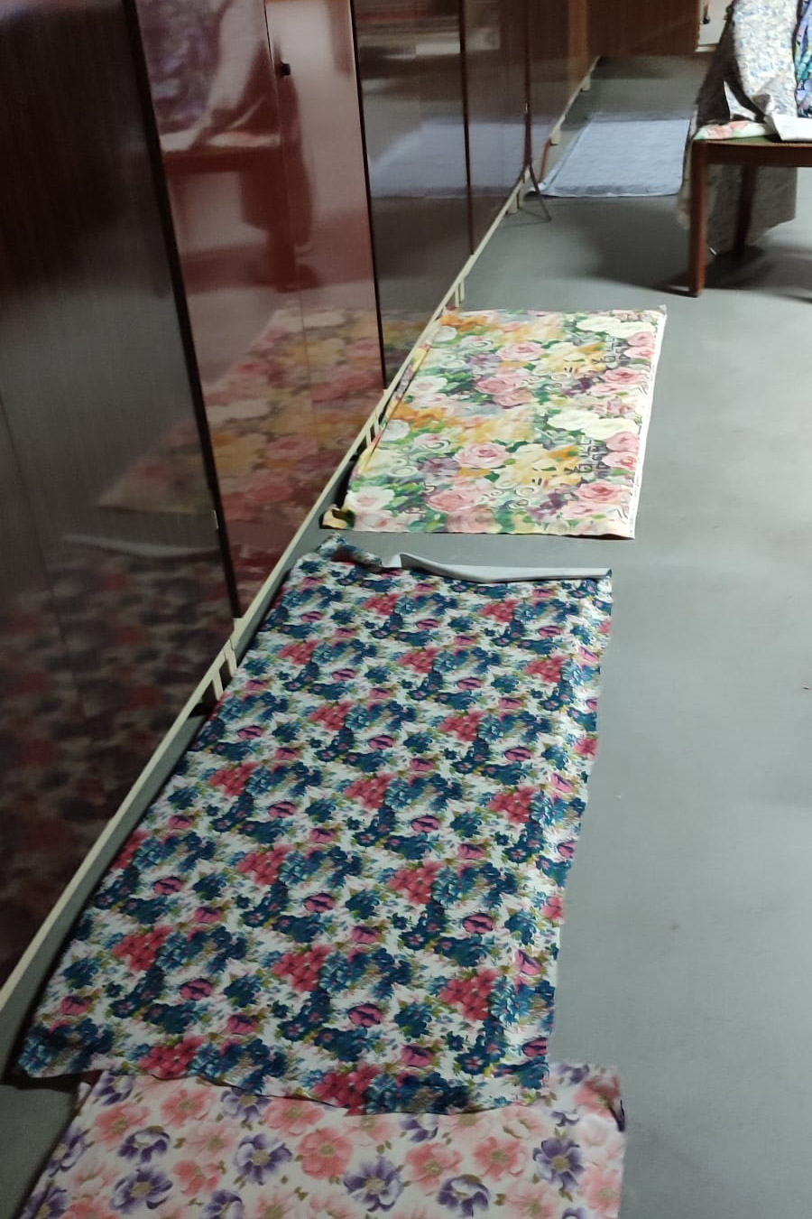 Donc, sur les panneaux que monsieur J. me remet, je colle (avec un pot de colle de 15 litres rangé dans une remise) des tissus au motifs fleuris. Cela amène directement la couleur. Sous l’œil de sœur Bernadette qui regarde tout ceci avec une grande confiance et avec la grande aide de sœur Cornelia qui répond à chacun de mes mails très rapidement, nous arrivons à monter l’exposition en quelques jours plein de labeur. Cela demande beaucoup d’énergie et je suis fatiguée. Chaque geste est fait avec amour et soin. J’espère tant réussir là où j’ai peur de faillir. Chaque pas permet d’avancer, et à chaque feuille que j’épingle sur les panneaux, c’est l’expo qui se monte sous mes yeux.